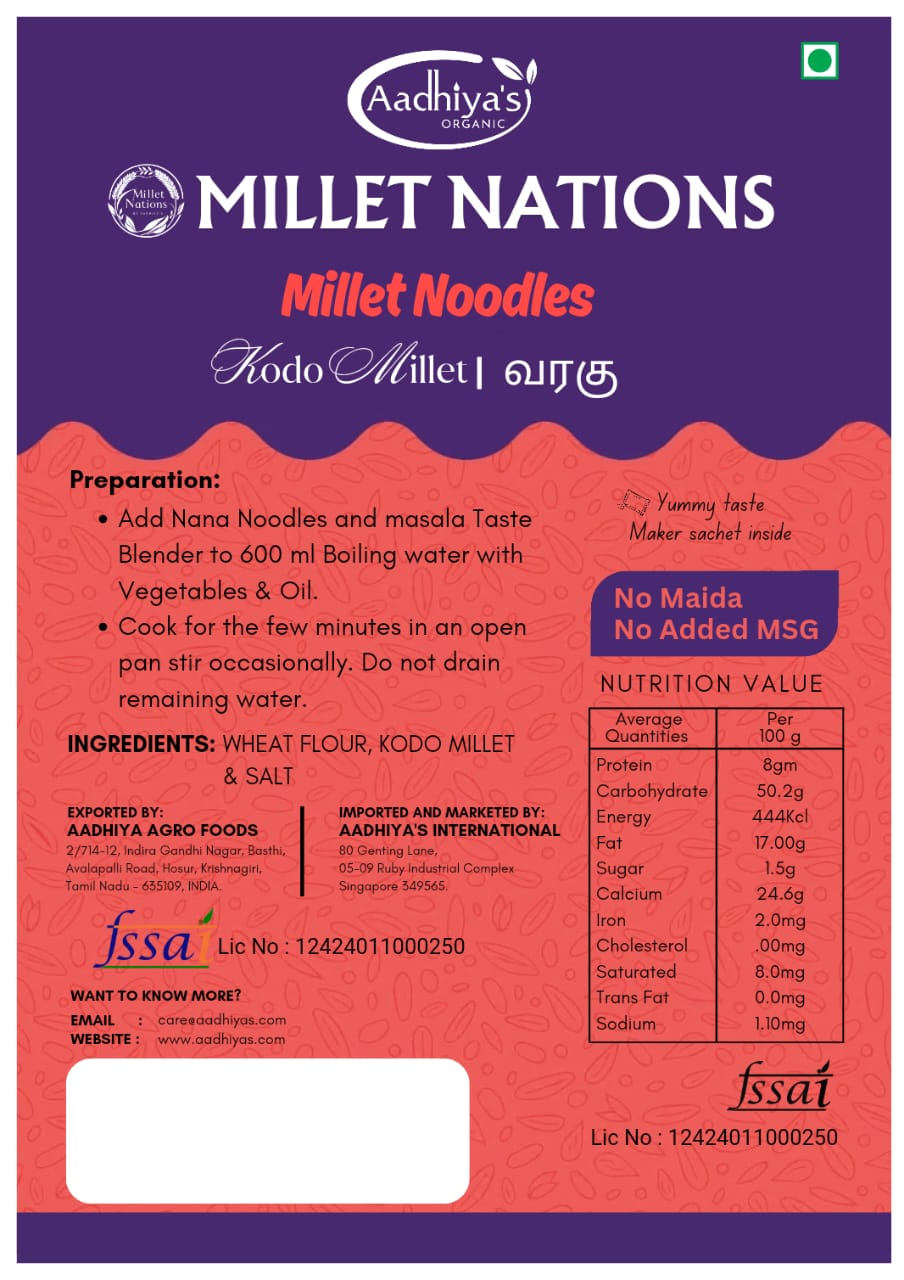Savor the nutritious benefits of Aadhiya'sKodo Millet Noodles(Varagu), made from kodo millet (Varagu). These noodles are gluten-free and packed with fiber, making them an excellent choice for healthy eating. Their unique flavor and texture enhance any dish, from traditional recipes to modern pasta creations. Quick to cook and easy to enjoy, they fit perfectly into your dietary preferences. Elevate your meals with the wholesome goodness of Aadhiya's Kodo Millet Noodles for a satisfying experience.