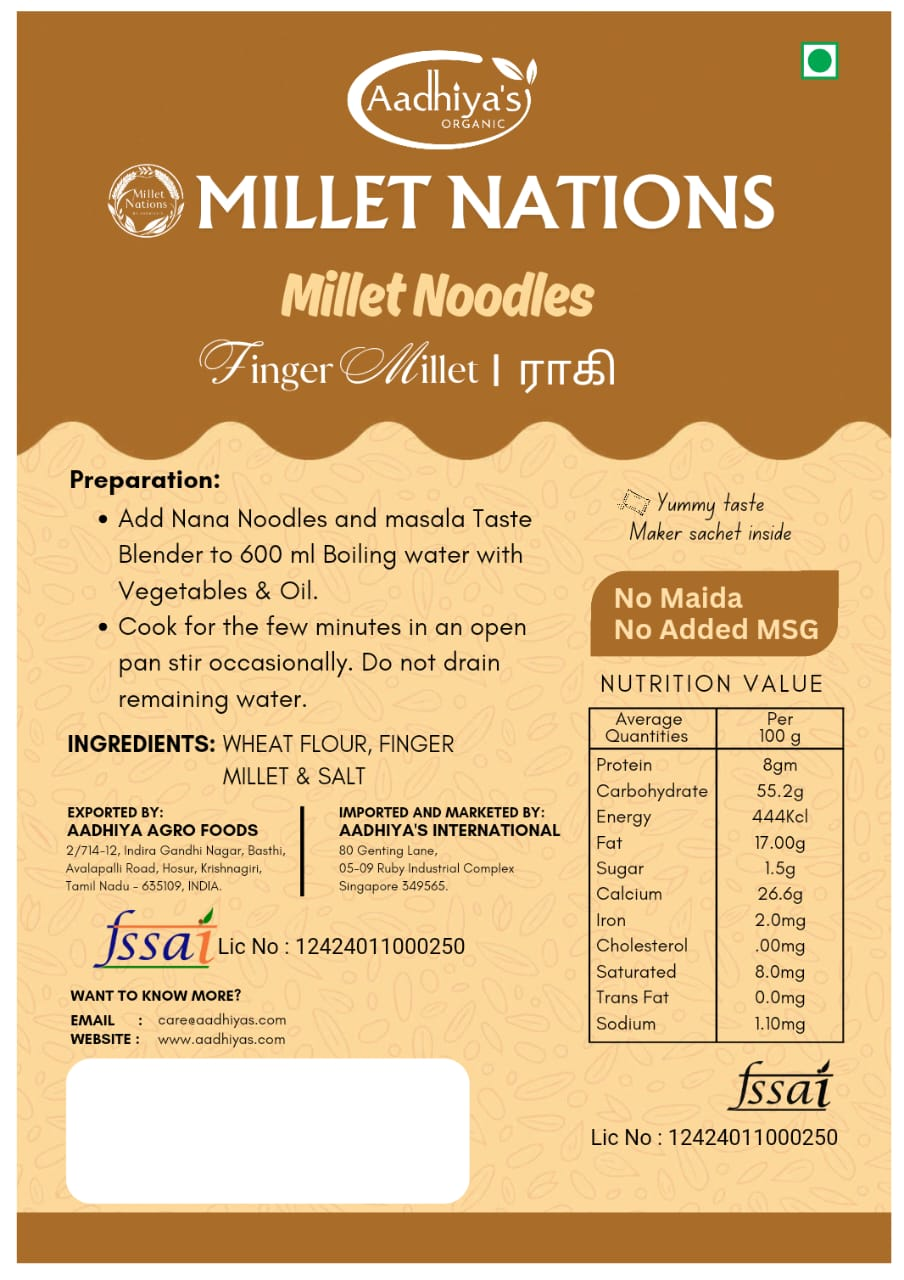 Aadhiya's Finger Millet Noodles are crafted from nutritious finger millet (Ragi), offering a delightful taste and texture. Rich in calcium and dietary fiber, these noodles are perfect for health-conscious individuals. They cook quickly and pair wonderfully with sauces, vegetables, or proteins, making them versatile for any dish. Enjoy the health benefits of millets while indulging in your favorite noodle meals. Elevate your dining experience with Aadhiya's Finger Millet Noodles for a nutritious and satisfying option.