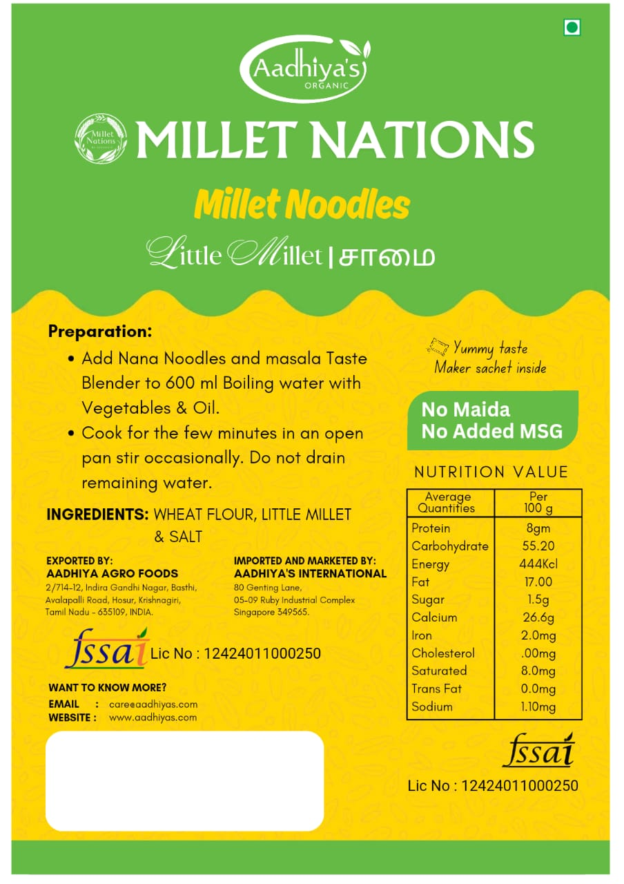 Enjoy Aadhiya's Little Millet Noodles, crafted from nutritious little millet (Samai). These noodles are gluten-free and high in fiber, making them a healthy addition to your meals. Their delightful texture holds sauces well, perfect for a variety of dishes, from pasta to salads. Quick and easy to cook, they provide a wholesome option for busy days. Experience the goodness of millets in every bite with Aadhiya's Little Millet Noodles for a healthful meal option.