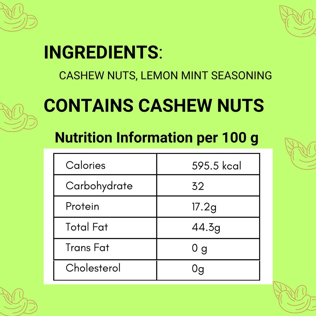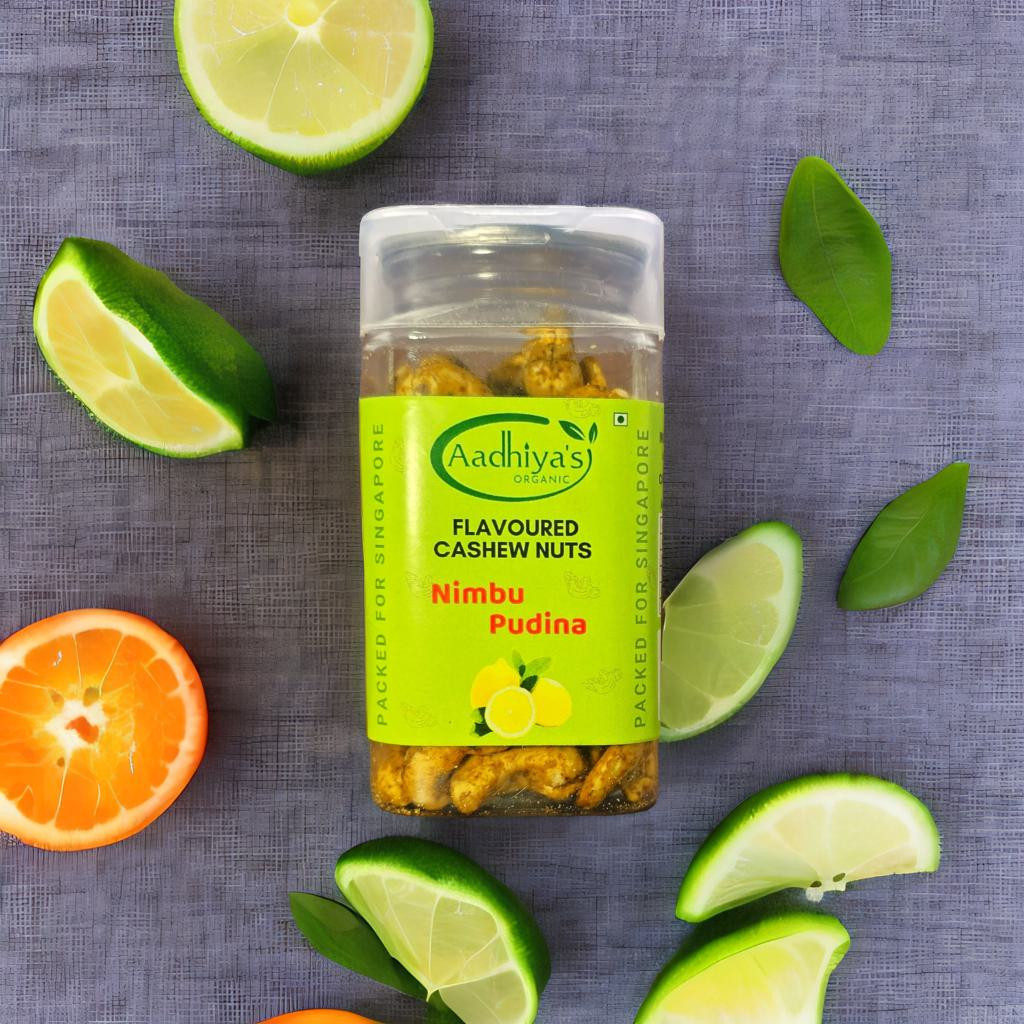 Savor the delightful taste of Aadhiya'sNimbu Pudina Premium Cashew Nuts. These crunchy cashews are seasoned with zesty lemon and refreshing mint, offering a unique flavor experience. Perfect as a snack or a party appetizer, they deliver a burst of flavor with every bite. The combination of citrusy and minty notes elevates the natural richness of cashews, making them irresistible. Enjoy the perfect blend of taste and nutrition with Aadhiya's Nimbu Pudina Cashew Nuts, a healthy choice for any occasion.
