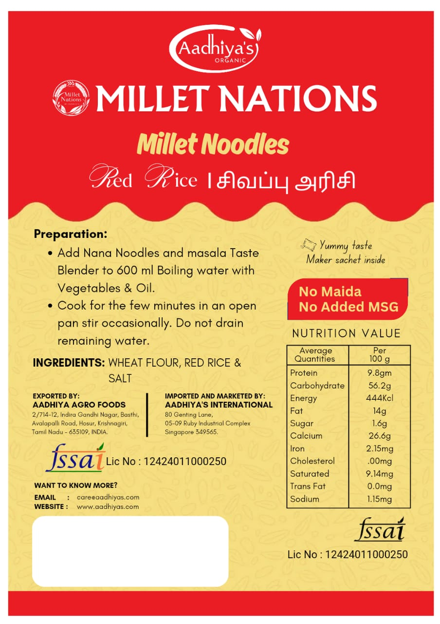 Experience the unique flavors of Aadhiya's Red Rice Millet Noodles. Crafted from a blend of red rice and millet, these noodles provide a delightful chewy texture and rich taste. They are high in antioxidants and essential nutrients, promoting overall health. Ideal for a variety of dishes, they add a colorful twist to your meals. Quick to cook and easy to incorporate into your favorite recipes, Aadhiya's Red Rice Millet Noodles are a perfect addition to your pantry.